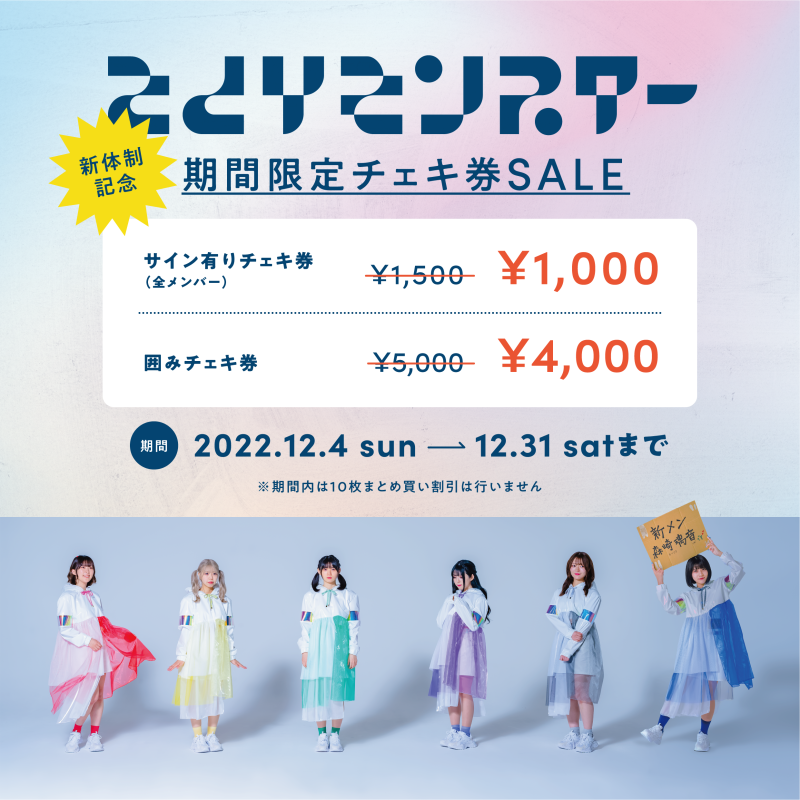 新メンバー加入&新体制記念としまして期間限定でチェキ券SALEを実施致します!!【期間】2022/12/4(日)〜2022/12/31(土)【対象商品】サインありチェキ券(全メンバー対象) ¥1,500→¥1,000囲みチェキ券 ¥5,000→¥4,000※対象期間内はチェキ券10枚まとめ買いの割引は対象外となります。 Tweet